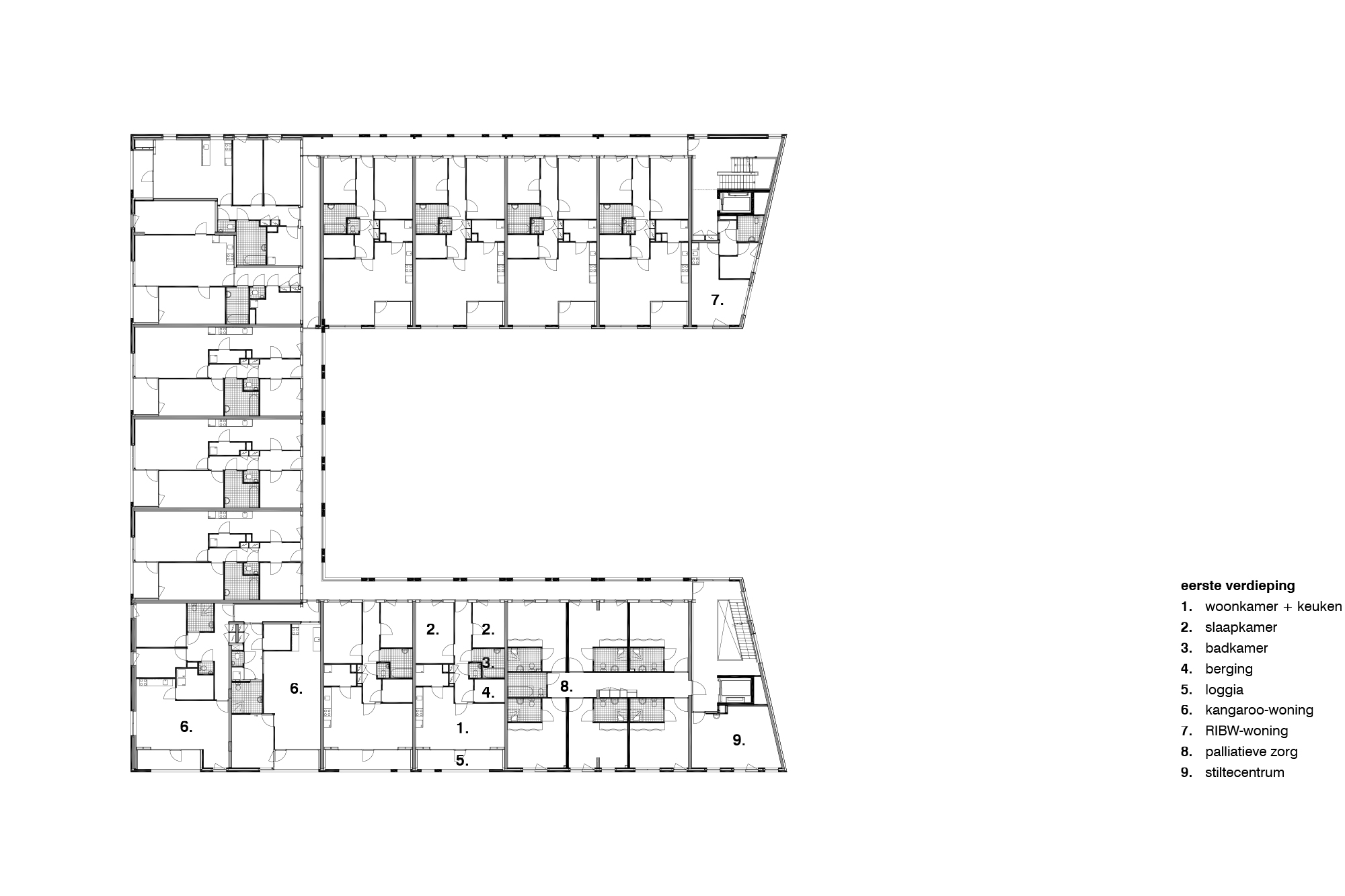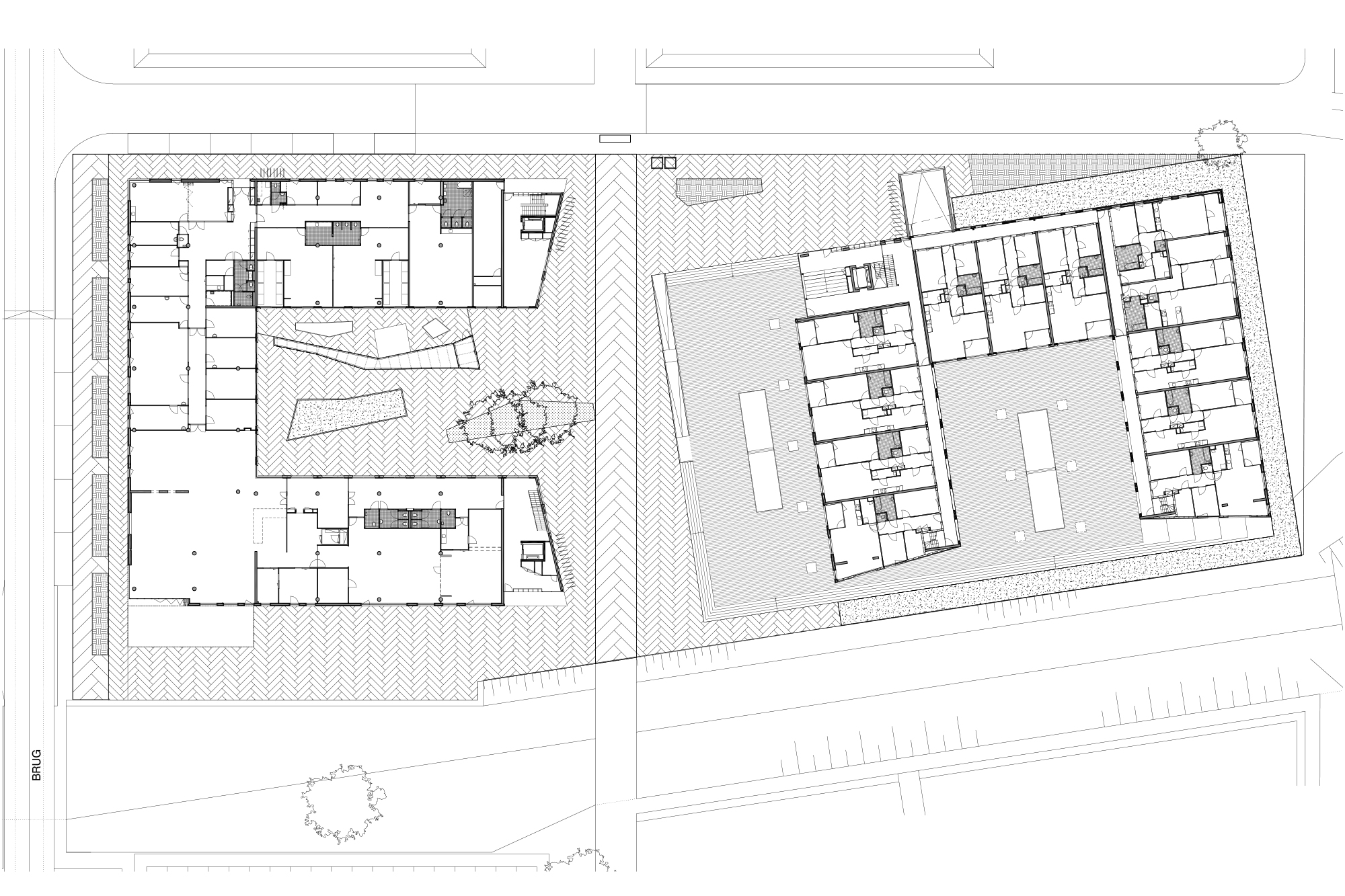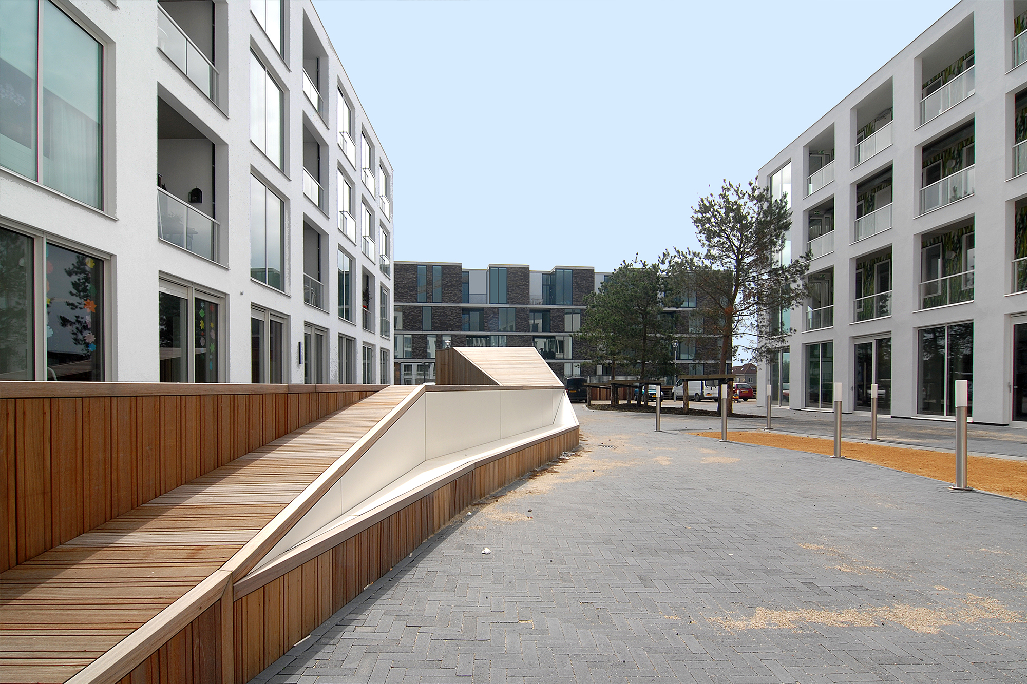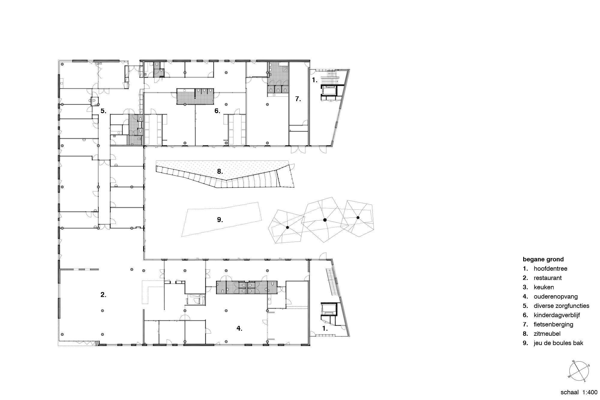 Hier liggen het kinderdagverblijf, de kinderpraktijk en het consultatiebureau bij elkaar aan de noordzijde en anderzijds het SWOC-restaurant-zotel aan de zuidvleugel. De buitengevel is van ruw bruin-paars metselwerk met wisselende penanten en horizontale banden als een filigrain gevelpositie. Aan de binnenhoven ligt een regelmatig grid van wit stucwerk, en een terugliggende gevel met een fris grasmotief. Zo ontstaat er een duidelijke binnen- en buitenzijde, die ter plaatse van het centrale plein, de voetgangersroute, bij elkaar komen.