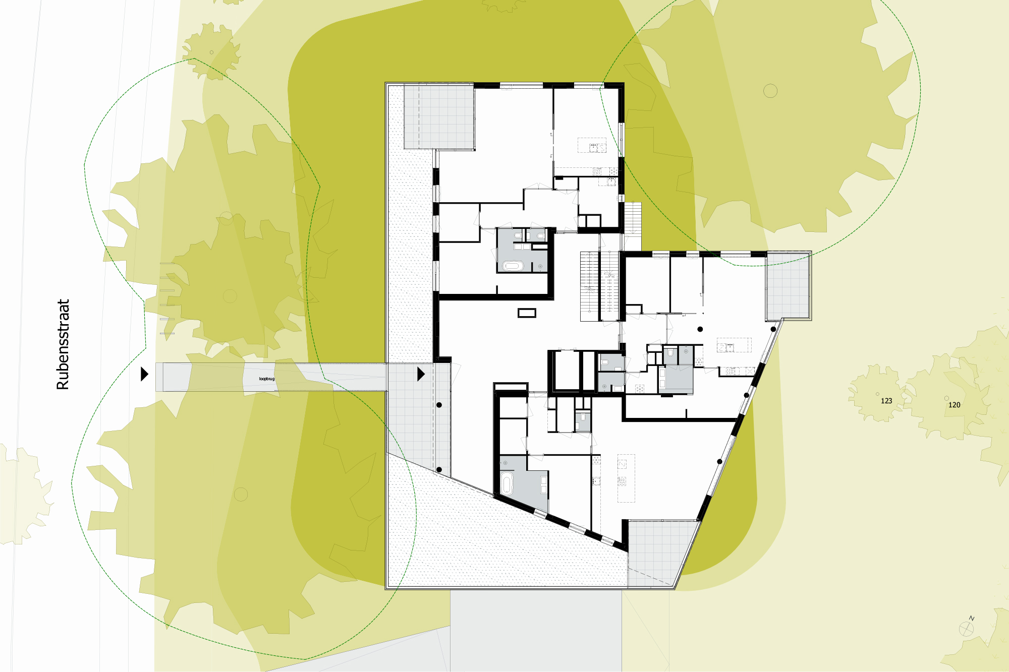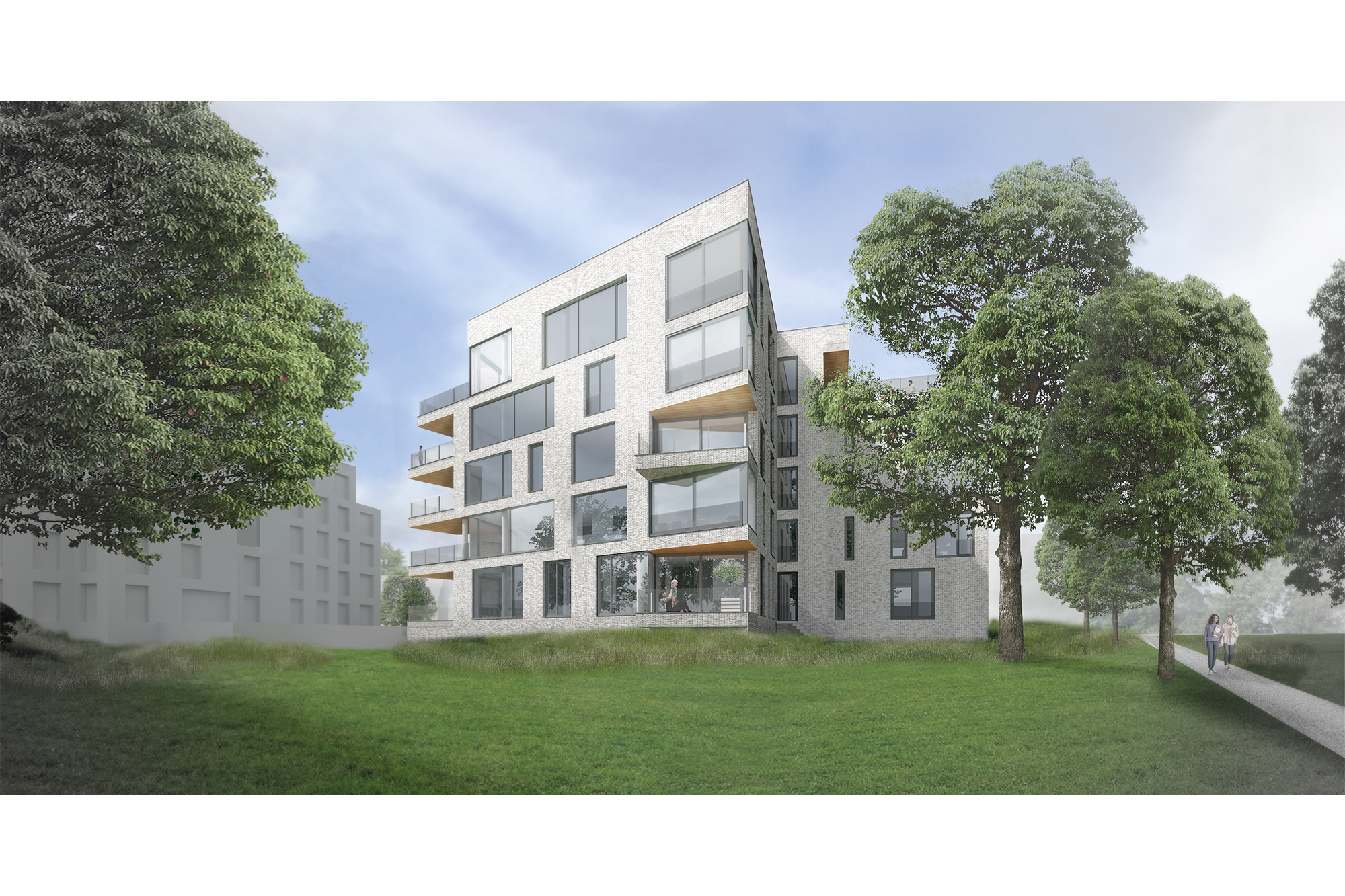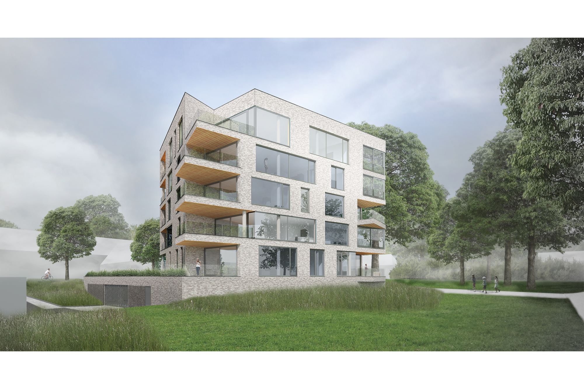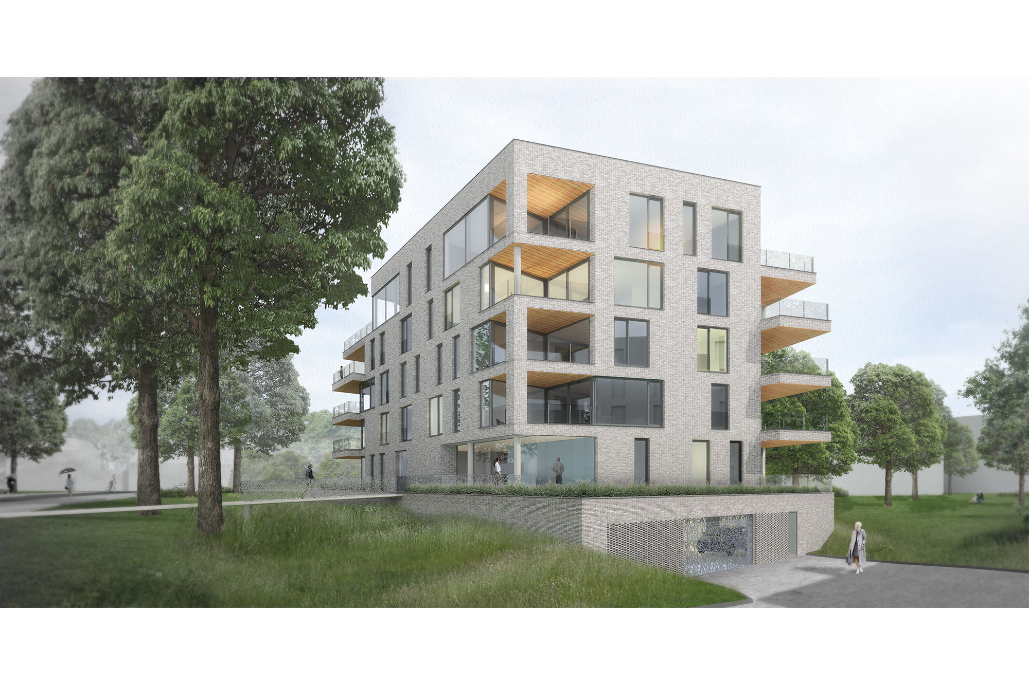 Uitgangspunt is een architectonisch object met sculpturale kwaliteit verzonken in een groen landschap. De schuine lijnen en de zorgvuldige positionering ervan in het landschap zorgt voor een dynamisch perspectief vanuit de omgeving. De gevel wordt bekleed met een licht grijze, genuanceerde gevelsteen en de plafonds van de buitenruimte worden afgewerkt met hout.
