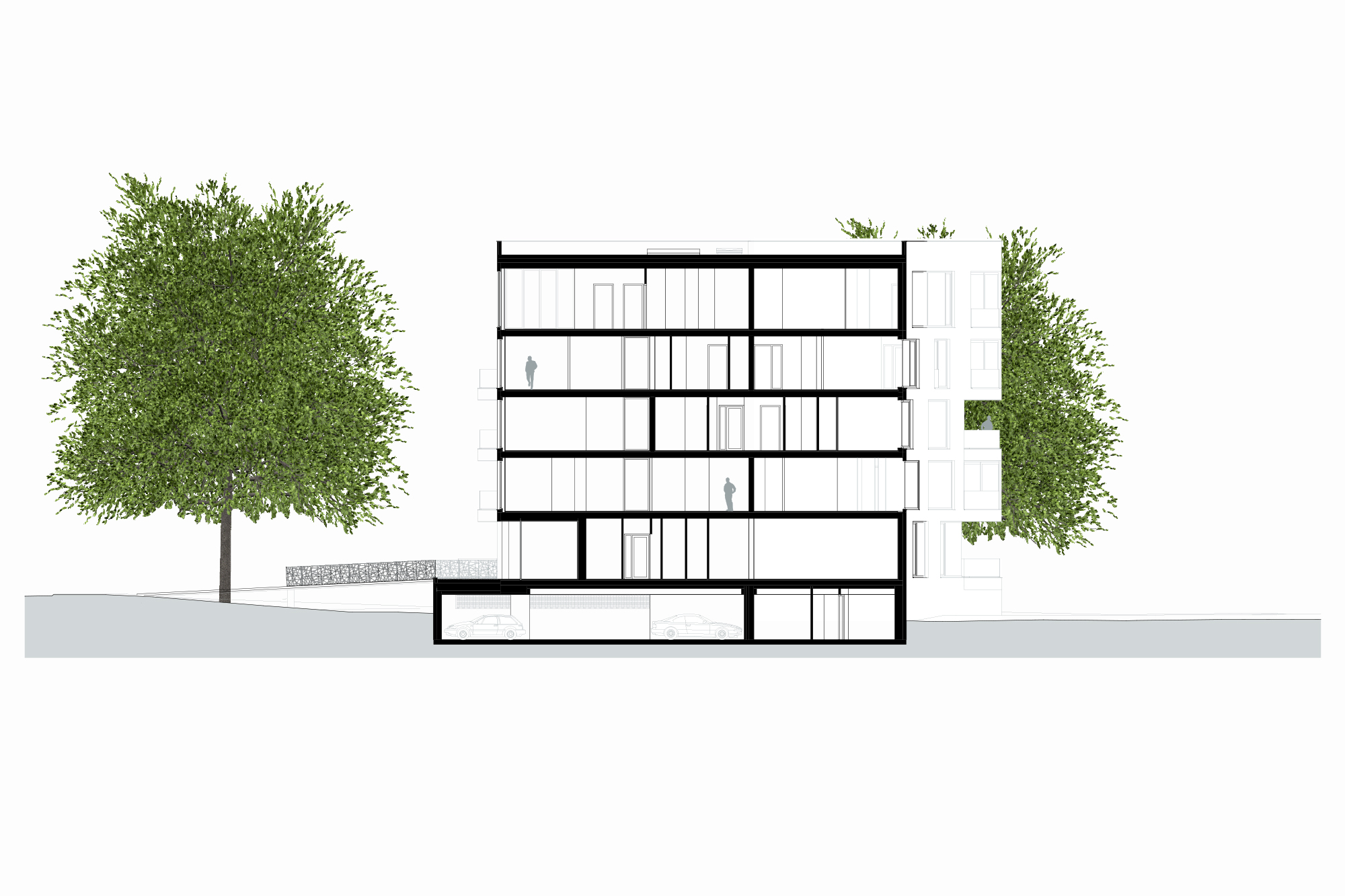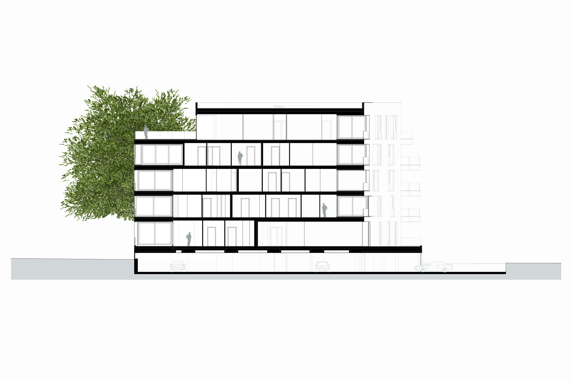 De gevel heeft in verhouding veel glas om de verbinding tussen binnen en buiten zo sterk mogelijk te maken. Door de verschillende woning plattegronden ontstaat er een compositie van herhalende raamopeningen en grote afwijkende vensters, waarbij het dichte gevelvlak rondom continueert en samenhang creëert. De privé buitenruimte zijn op de hoeken gepositioneerd en kragen soms iets uit voor een optimale bezonning en uitzicht.