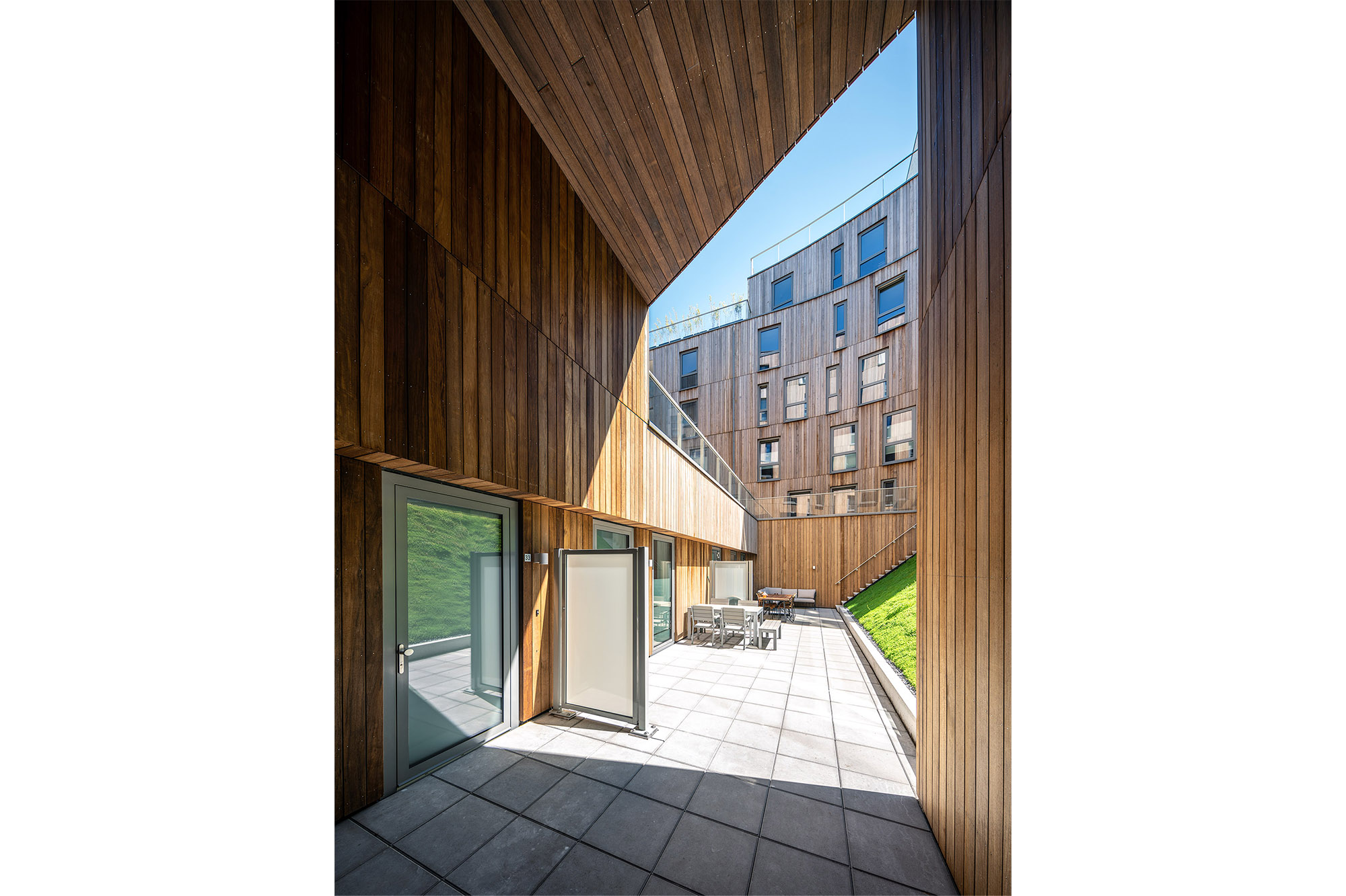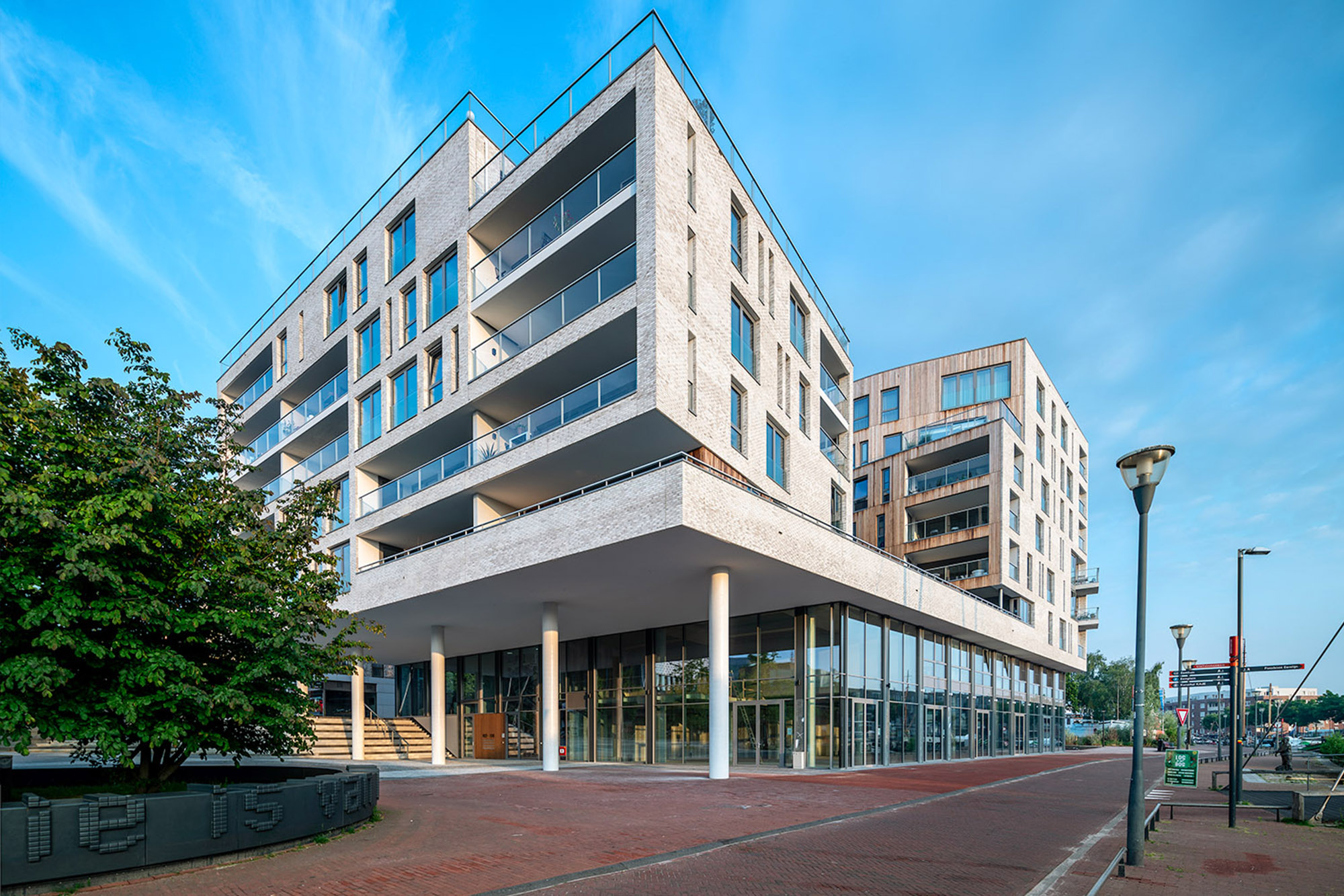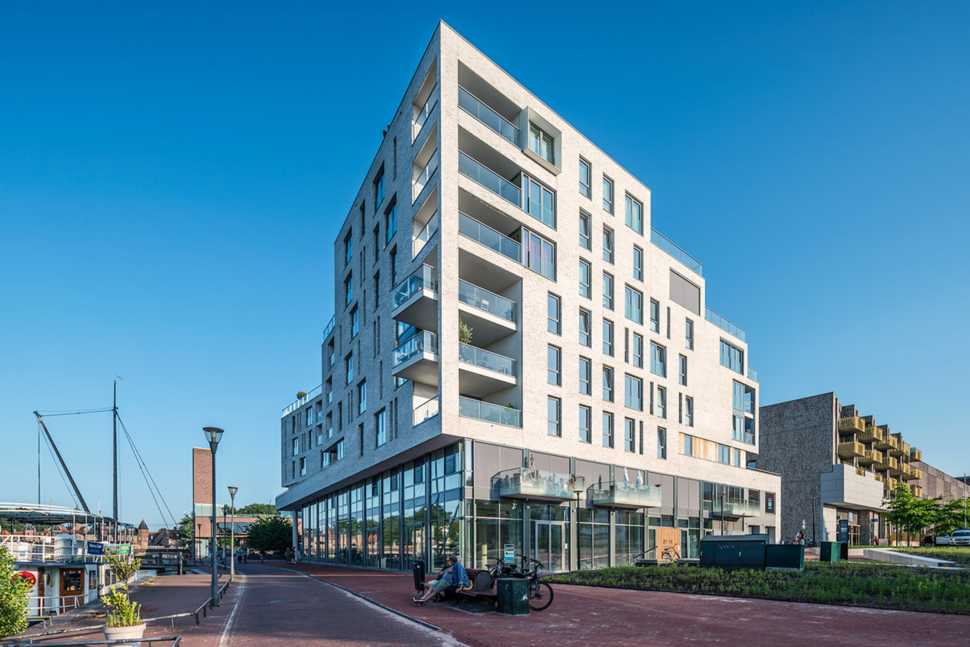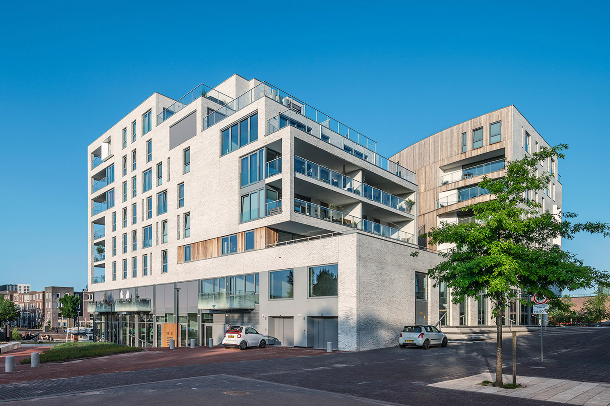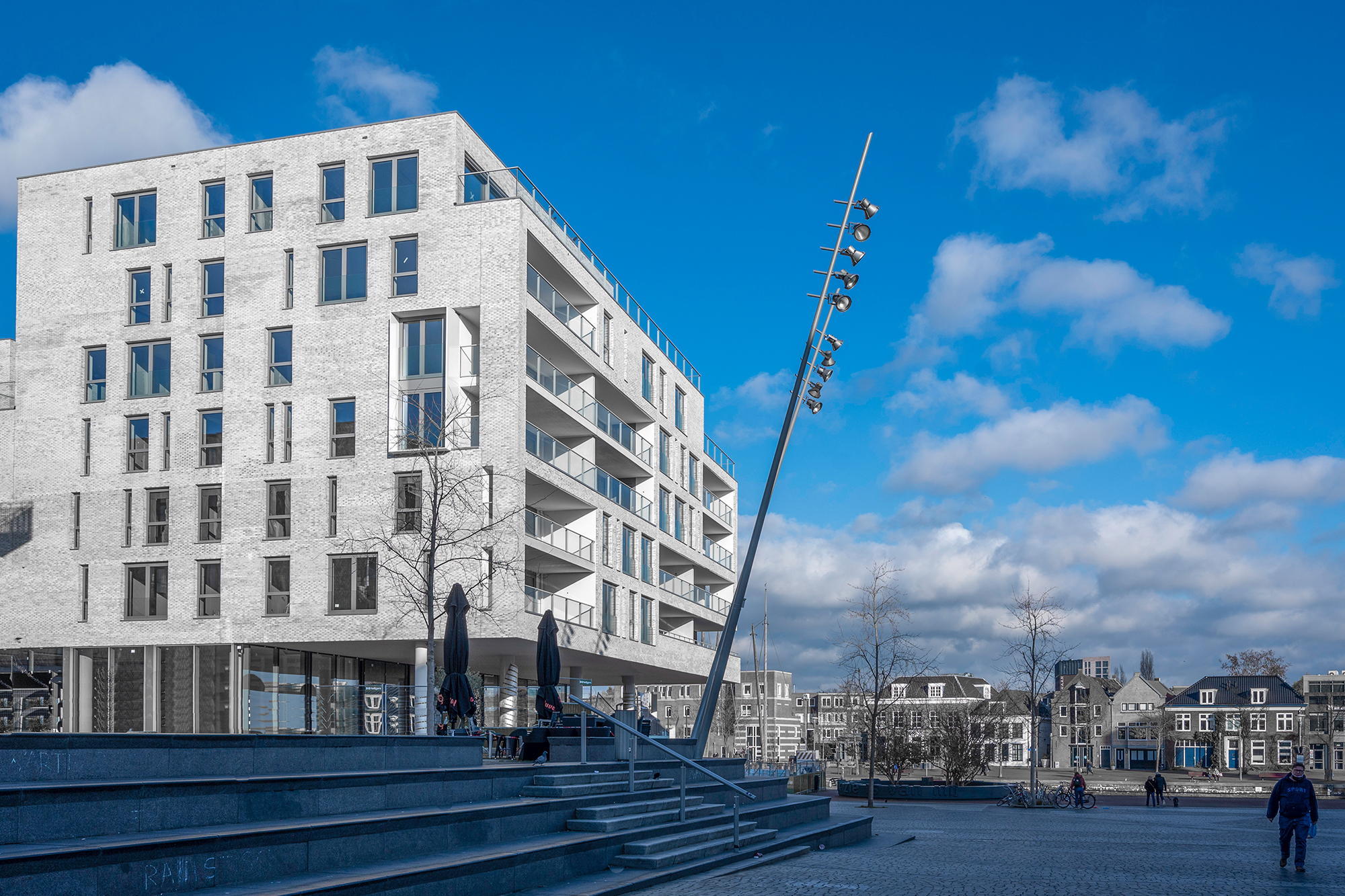 Het gebouw is op de begane grond overkragend, hierdoor wordt de visuele verbinding tussen plein en de Eem. Het gebouw is geleed in twee terrasvormige oplopende volumes die een groen binnentuin omsluiten. Met deze ingreep ontstaat er ruimte waar zonlicht kan doordringen tot de Eem. De plint bevat commerciële ruimte, horeca aan het plein en een stadsruimte aan de kade. Deze ruimte is bedoeld als een democratische ruimte waar de stad met al haar initiatieven een plek kunnen krijgen. Daarboven bevinden zich 38 grote woningen met een alzijdige uitstraling en grote dakterrassen. De plint wordt uitgevoerd in glas met een fijn raster, de bovenbouw in een lichte steen voor de buitenkant en in hout voor de golvende binnen gevel. Grote stadsvensters en terrassen geven rondom uitzicht op de stad, het plein en de Eem.