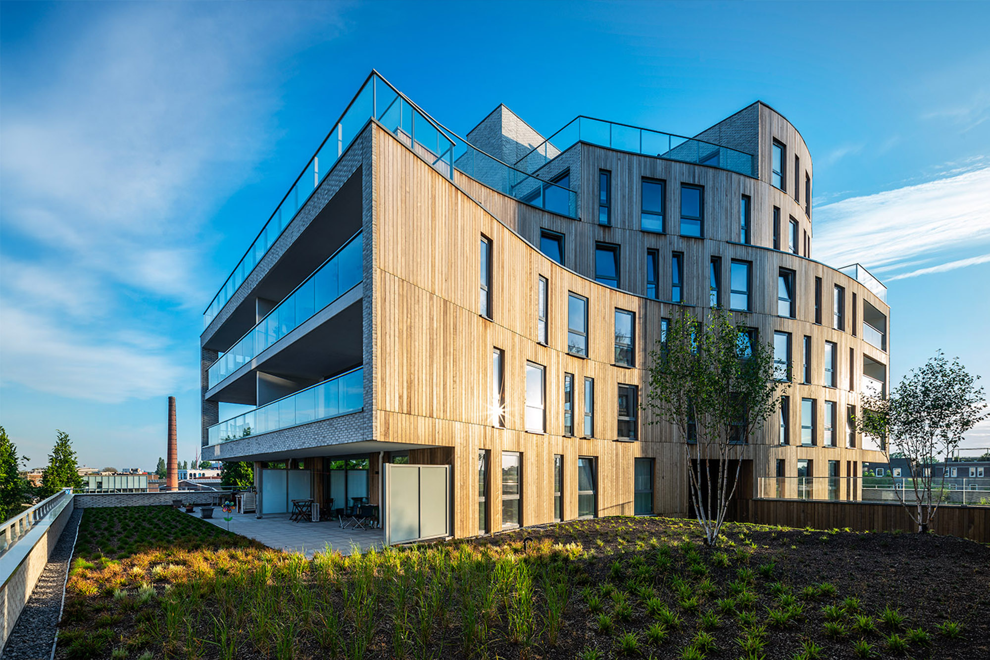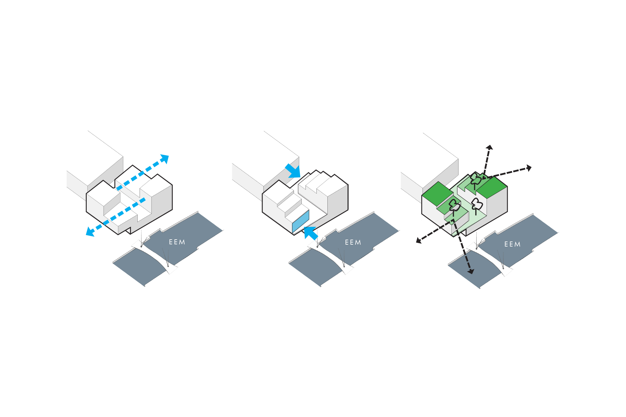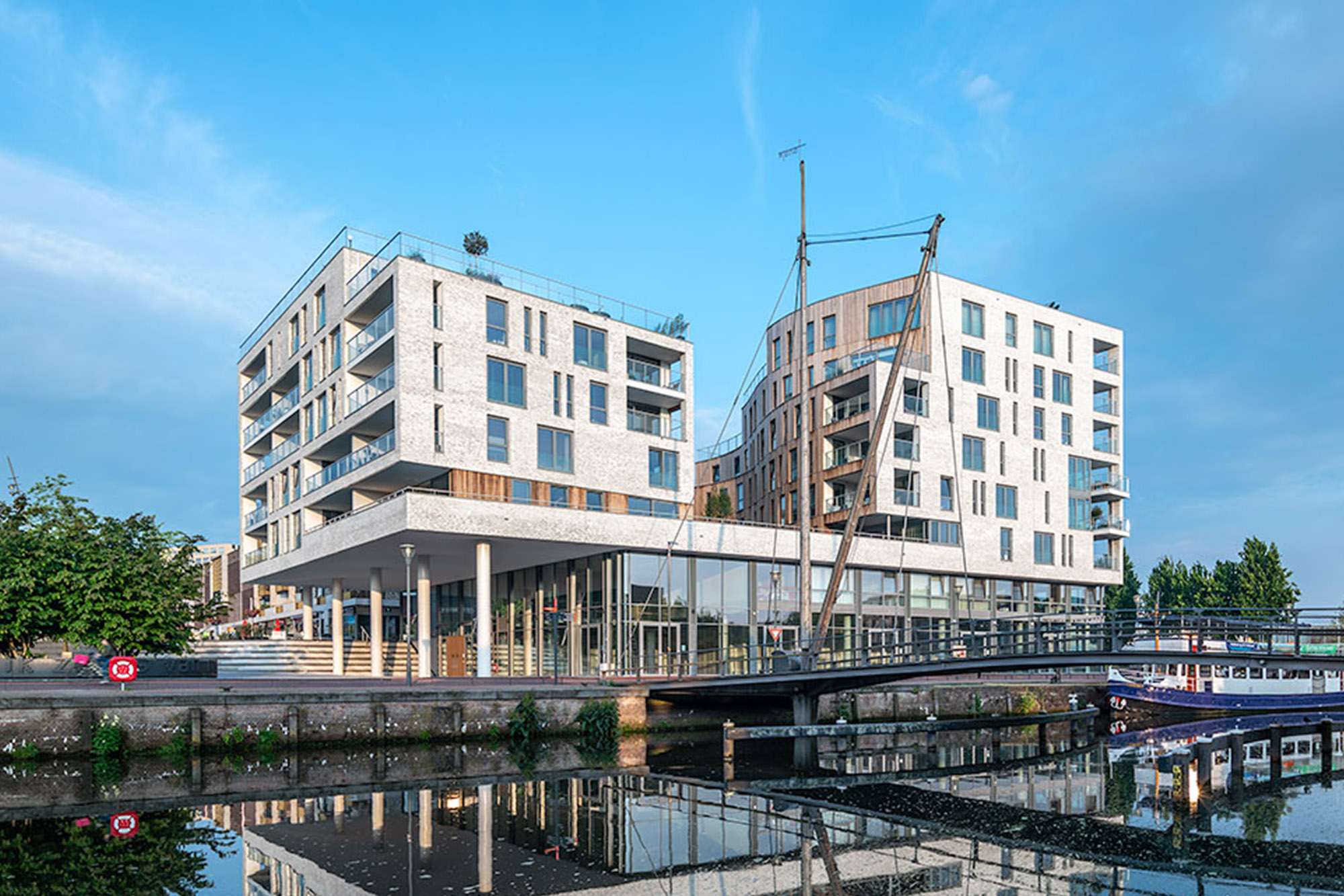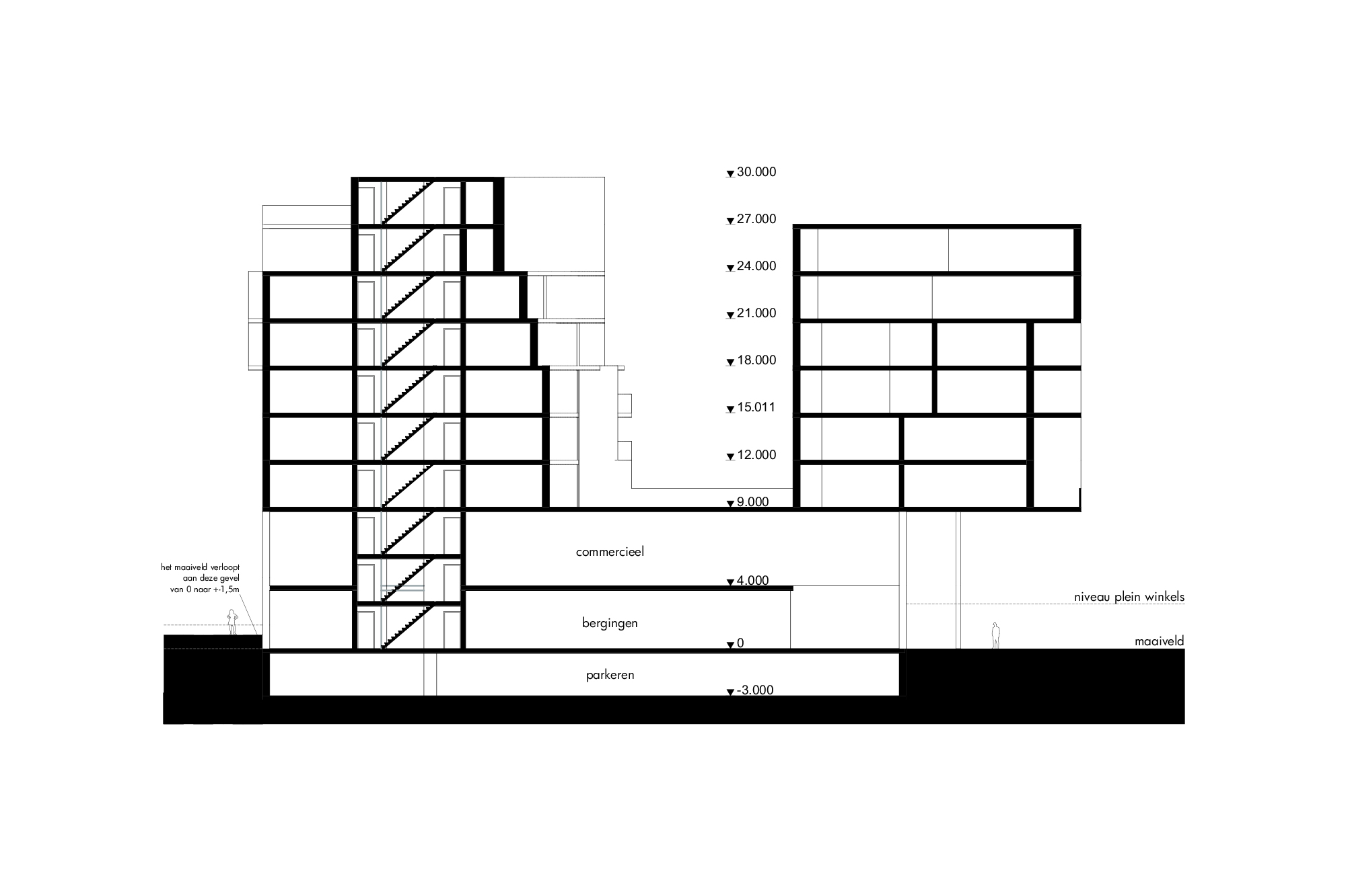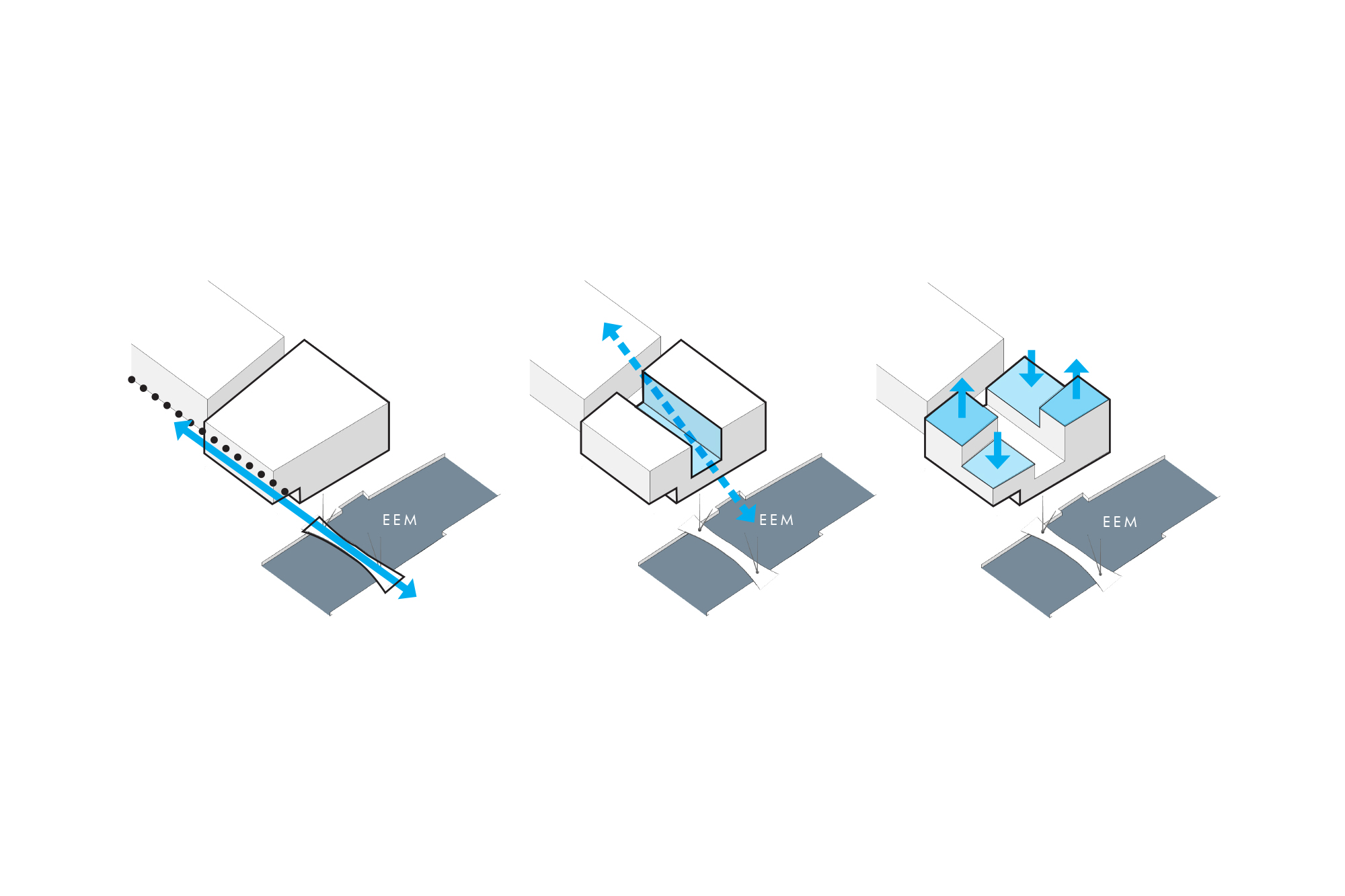 Het gebouw is op de begane grond overkragend, hierdoor wordt de visuele verbinding tussen plein en de Eem. Het gebouw is geleed in twee terrasvormige oplopende volumes die een groen binnentuin omsluiten. Met deze ingreep ontstaat er ruimte waar zonlicht kan doordringen tot de Eem. De plint bevat commerciële ruimte, horeca aan het plein en een stadsruimte aan de kade. Deze ruimte is bedoeld als een democratische ruimte waar de stad met al haar initiatieven een plek kunnen krijgen. Daarboven bevinden zich 38 grote woningen met een alzijdige uitstraling en grote dakterrassen. De plint wordt uitgevoerd in glas met een fijn raster, de bovenbouw in een lichte steen voor de buitenkant en in hout voor de golvende binnen gevel. Grote stadsvensters en terrassen geven rondom uitzicht op de stad, het plein en de Eem.