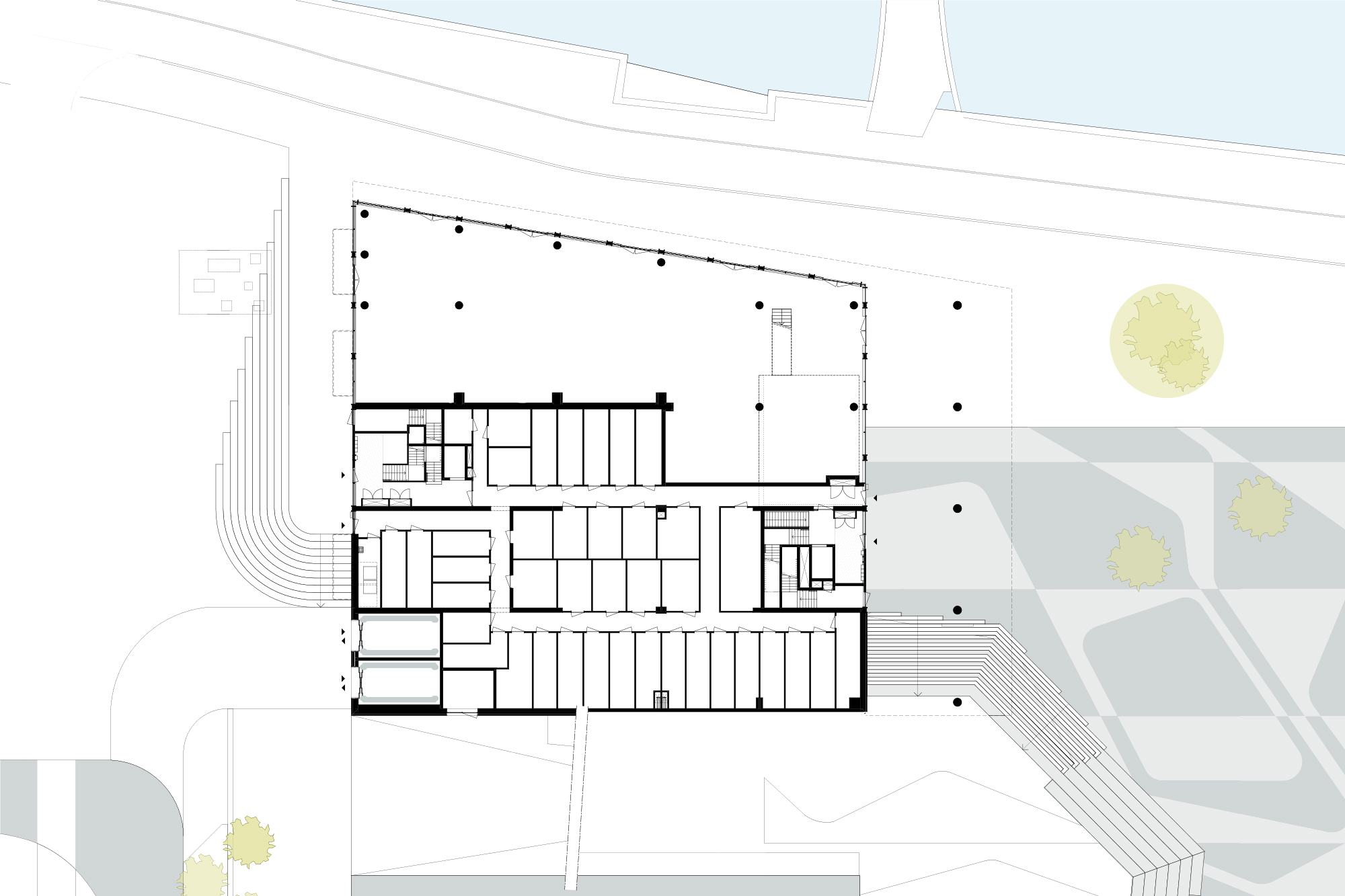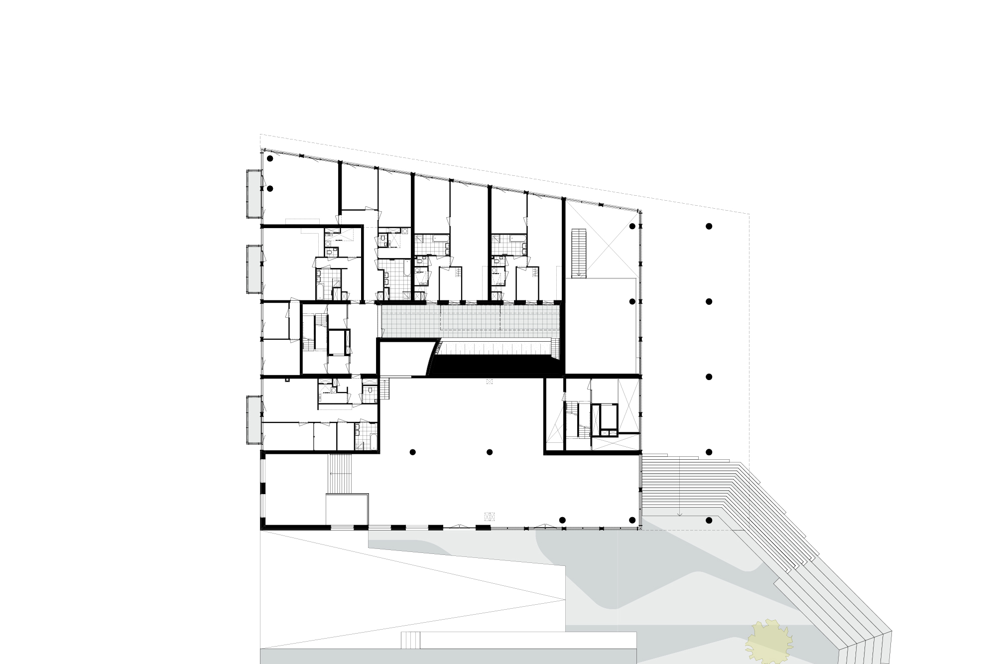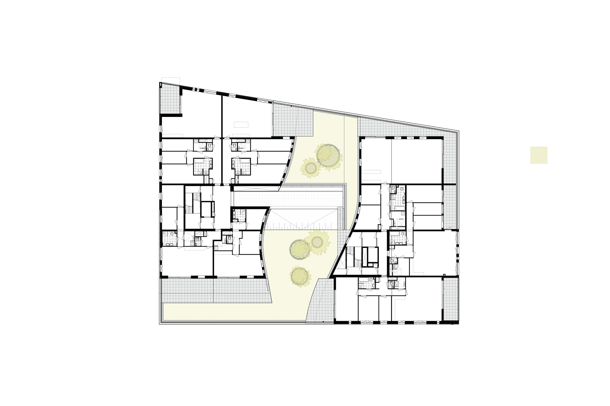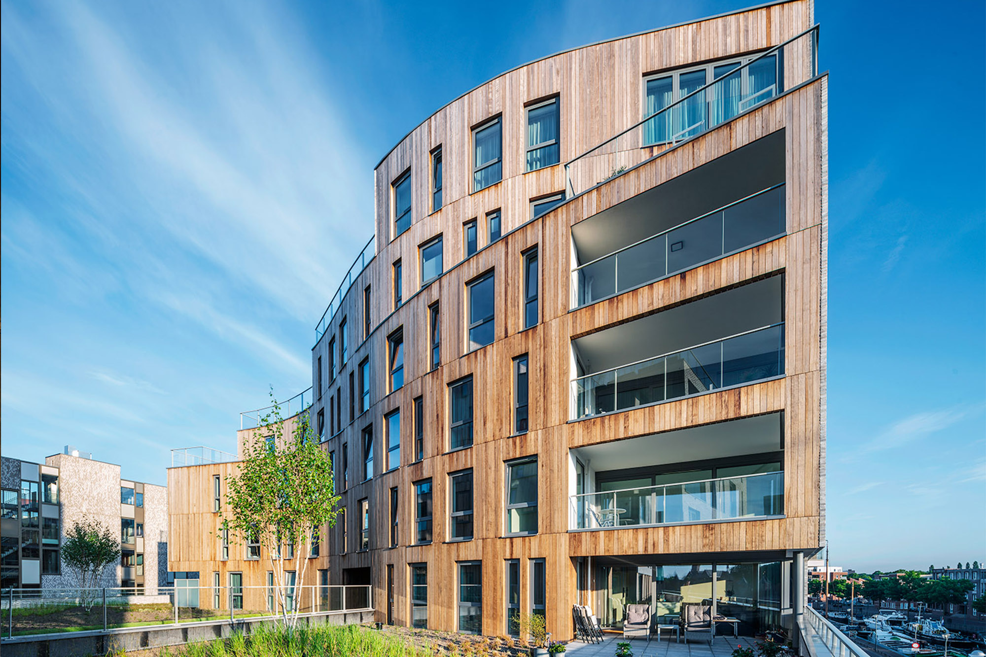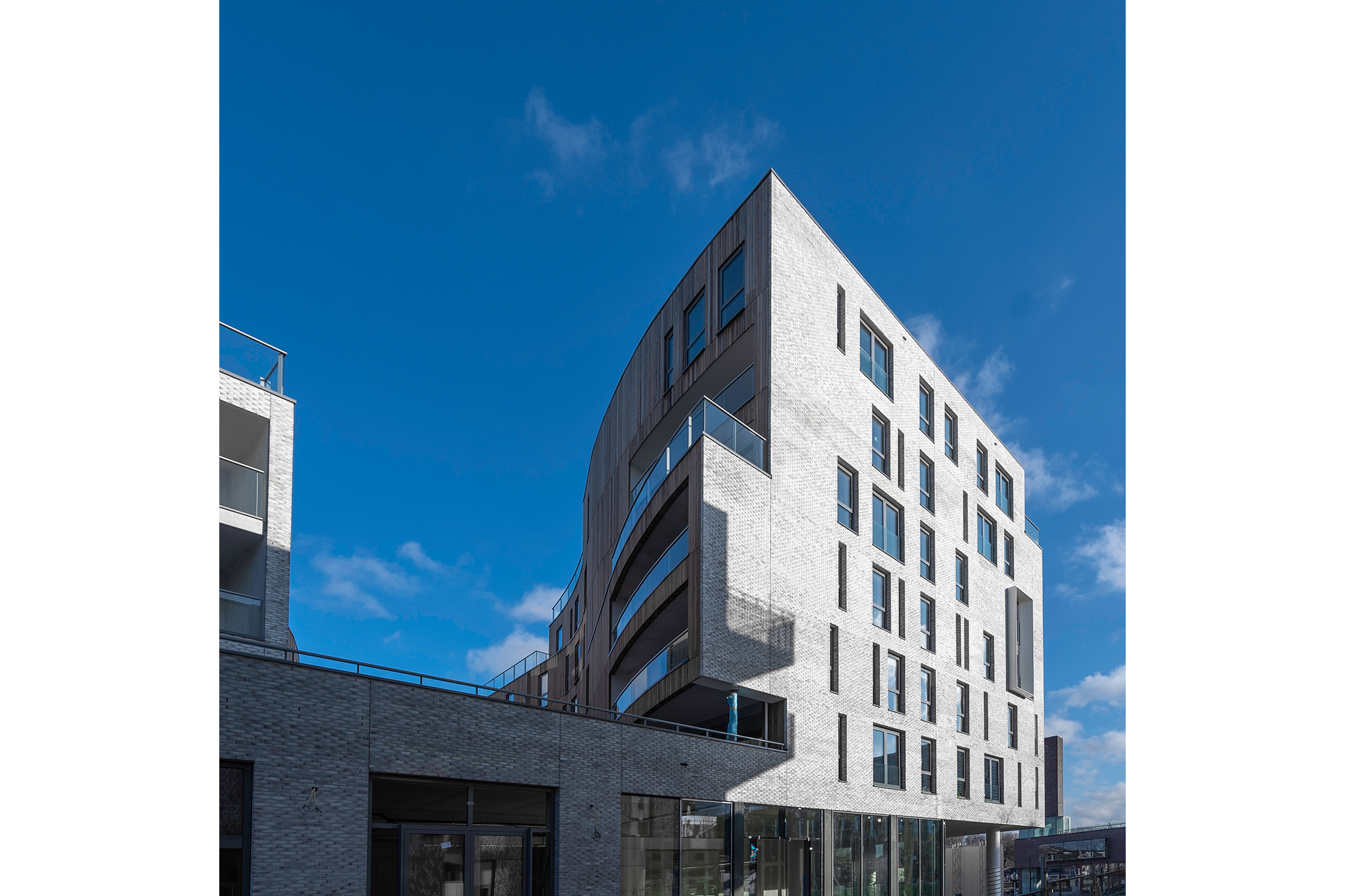 Het gebouw is op de begane grond overkragend, hierdoor wordt de visuele verbinding tussen plein en de Eem. Het gebouw is geleed in twee terrasvormige oplopende volumes die een groen binnentuin omsluiten. Met deze ingreep ontstaat er ruimte waar zonlicht kan doordringen tot de Eem. De plint bevat commerciële ruimte, horeca aan het plein en een stadsruimte aan de kade. Deze ruimte is bedoeld als een democratische ruimte waar de stad met al haar initiatieven een plek kunnen krijgen. Daarboven bevinden zich 38 grote woningen met een alzijdige uitstraling en grote dakterrassen. De plint wordt uitgevoerd in glas met een fijn raster, de bovenbouw in een lichte steen voor de buitenkant en in hout voor de golvende binnen gevel. Grote stadsvensters en terrassen geven rondom uitzicht op de stad, het plein en de Eem.