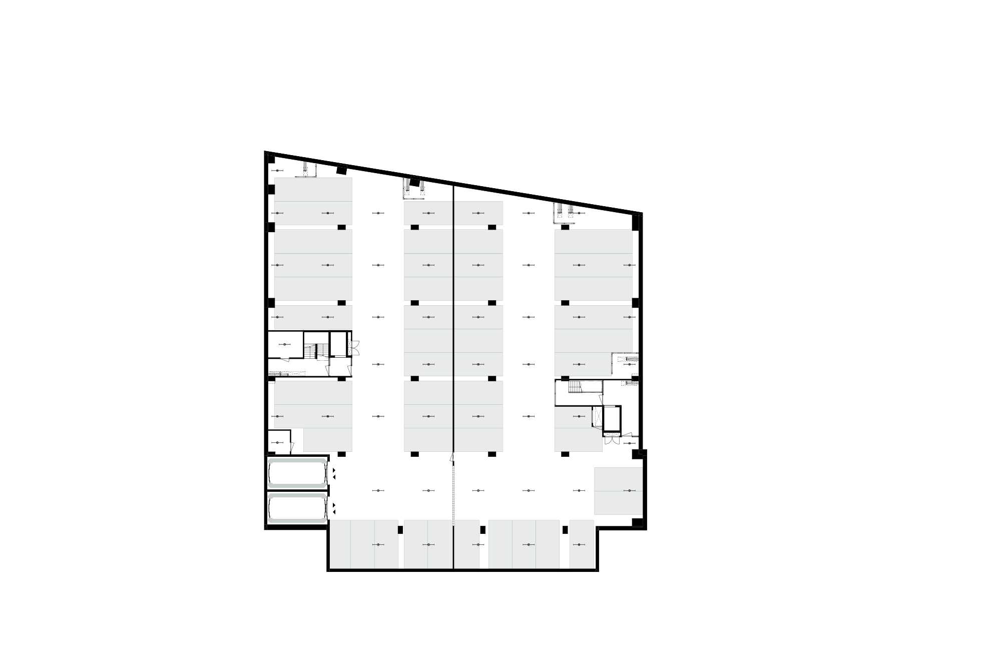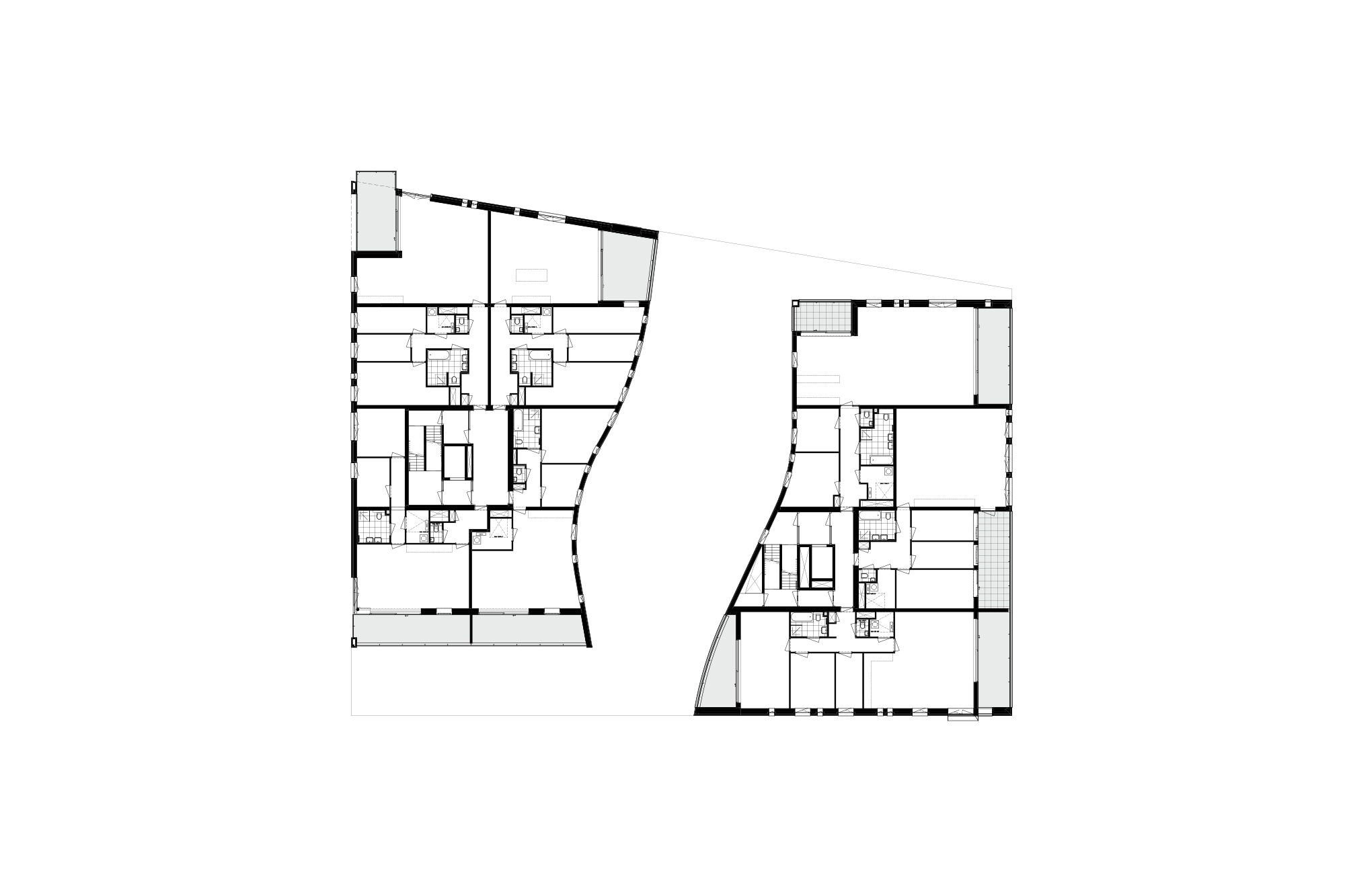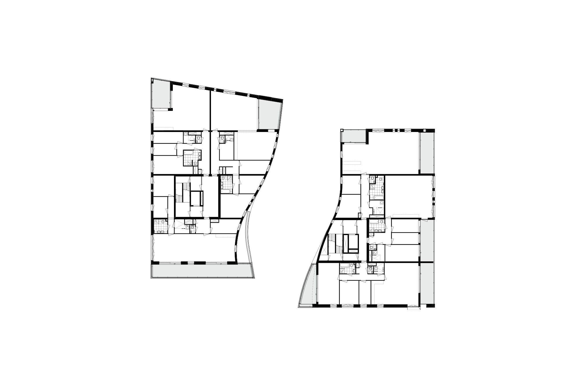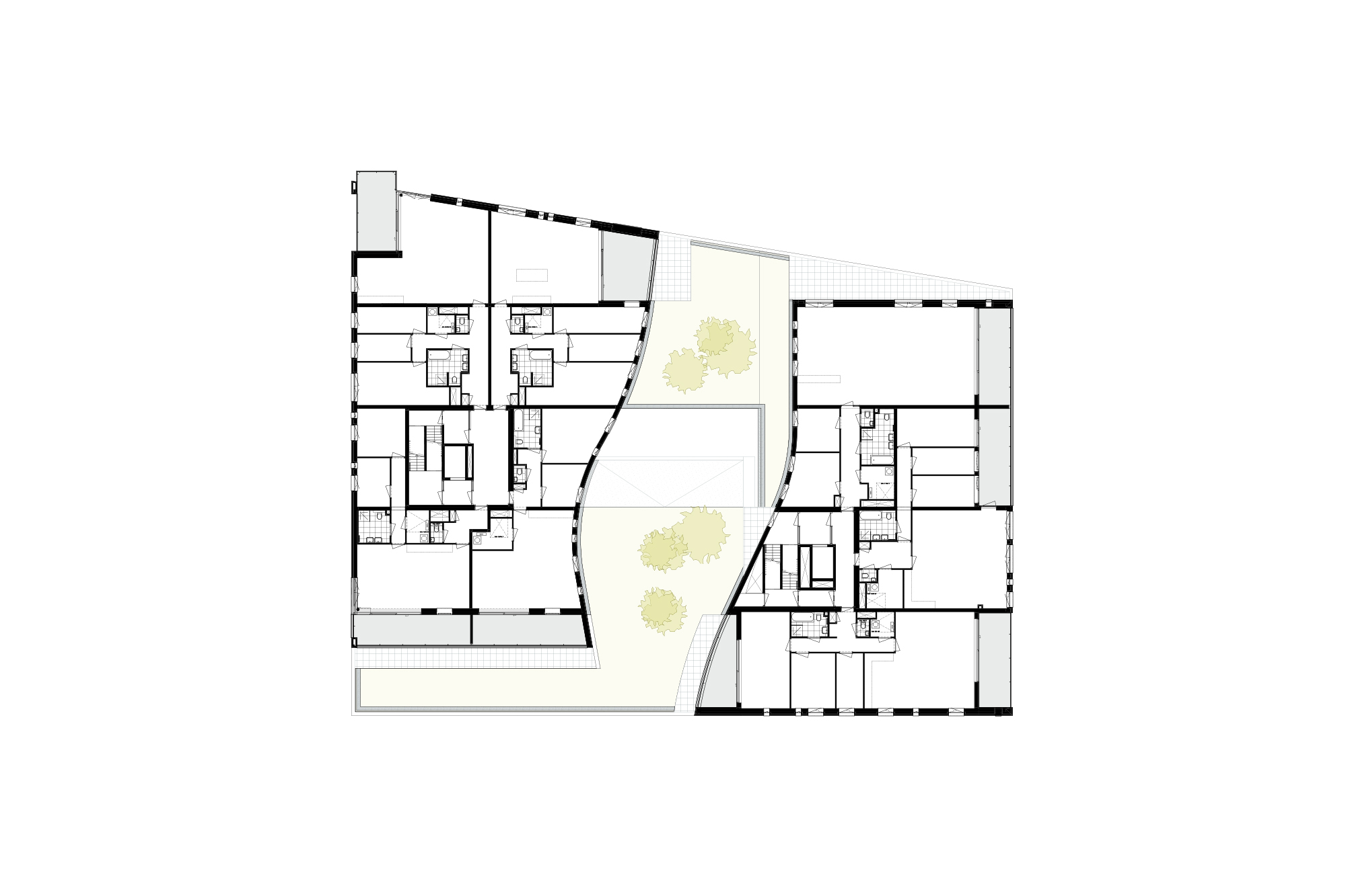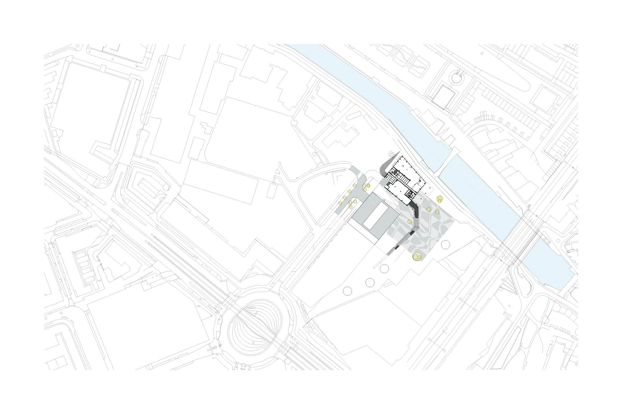 Het gebouw is op de begane grond overkragend, hierdoor wordt de visuele verbinding tussen plein en de Eem. Het gebouw is geleed in twee terrasvormige oplopende volumes die een groen binnentuin omsluiten. Met deze ingreep ontstaat er ruimte waar zonlicht kan doordringen tot de Eem. De plint bevat commerciële ruimte, horeca aan het plein en een stadsruimte aan de kade. Deze ruimte is bedoeld als een democratische ruimte waar de stad met al haar initiatieven een plek kunnen krijgen. Daarboven bevinden zich 38 grote woningen met een alzijdige uitstraling en grote dakterrassen. De plint wordt uitgevoerd in glas met een fijn raster, de bovenbouw in een lichte steen voor de buitenkant en in hout voor de golvende binnen gevel. Grote stadsvensters en terrassen geven rondom uitzicht op de stad, het plein en de Eem.