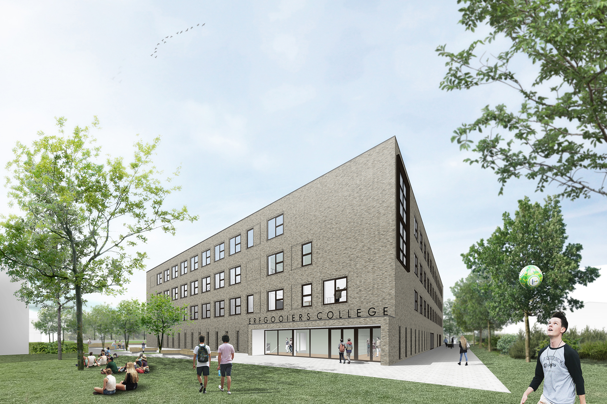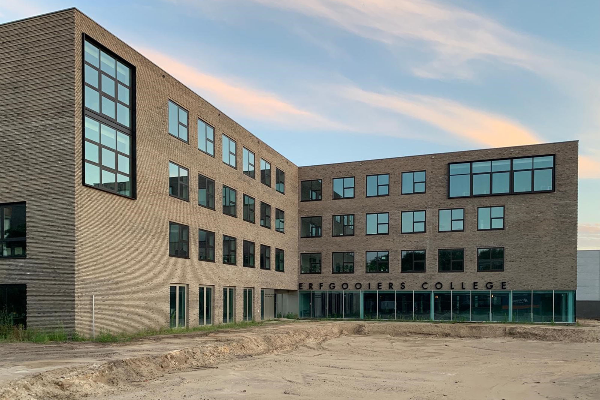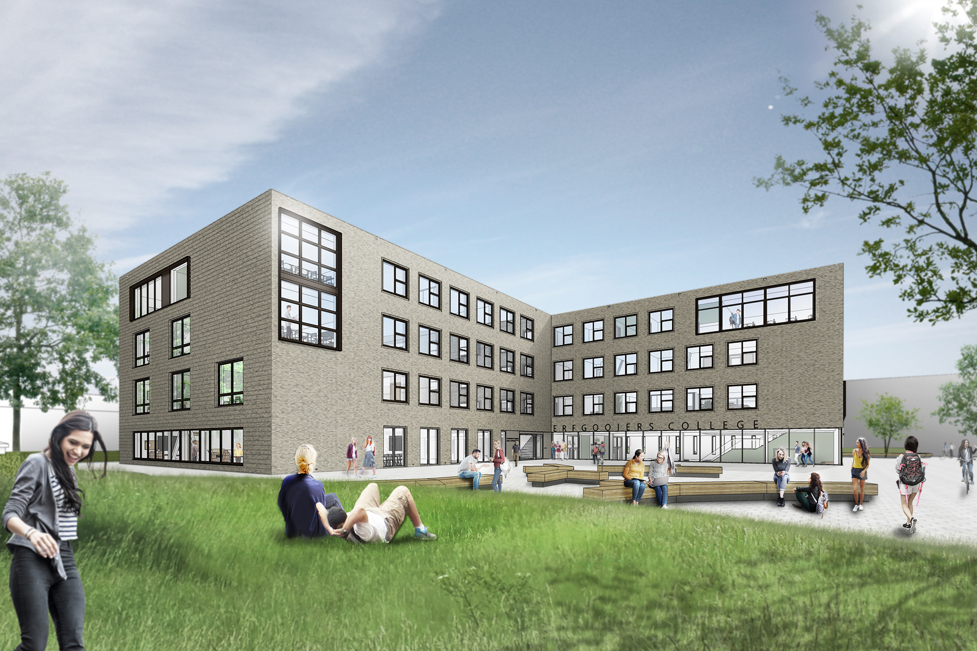 De gevelopeningen op de verdiepingen zijn in een raster geplaatst. De herhaling van hetzelfde element geeft eenheid rondom en vormt een solide basis. Het raster wordt op een aantal strategische plekken doorbroken met grote vensters. Deze geven gericht uitzicht op de omgeving, maar maken ook het onderwijs zichtbaar op bovenste lagen. De vensters gaan soms over meerdere bouwlagen als verbinder tussen de verschillende vak domeinen of ze koppelen horizontaal specifieke onderwijsruimte, zoals een lokaal met een studieplein. Daarmee komt de onderwijsvisie en de identiteit van de school tot uiting in de gevel. De openingen in de kopgevel aan het Gooierserf zijn van groter formaat, zodat vanaf straatniveau het onderwijs op alle bouwlagen zichtbaar wordt gemaakt. De andere kopgevel is daar een variant op.