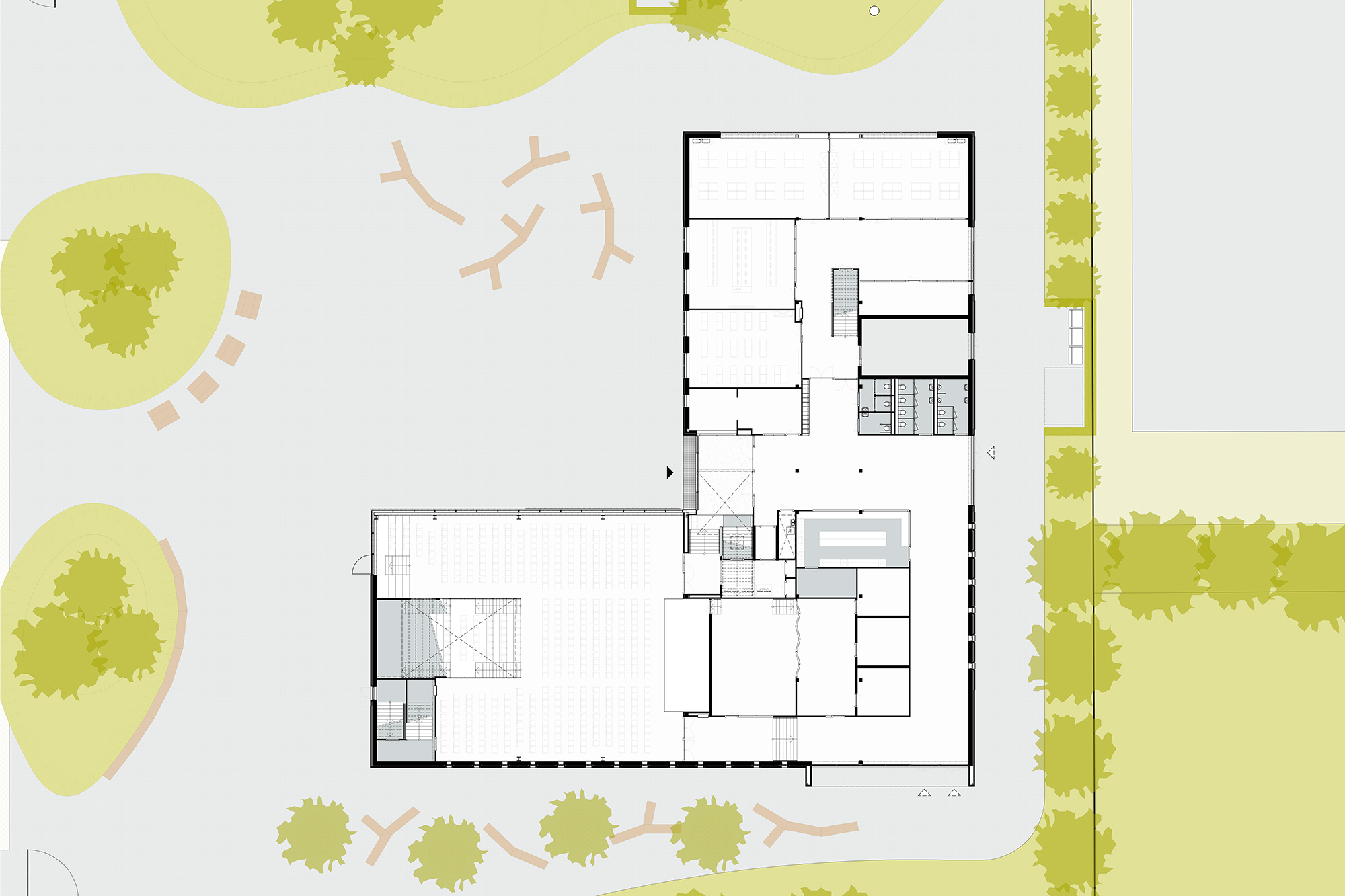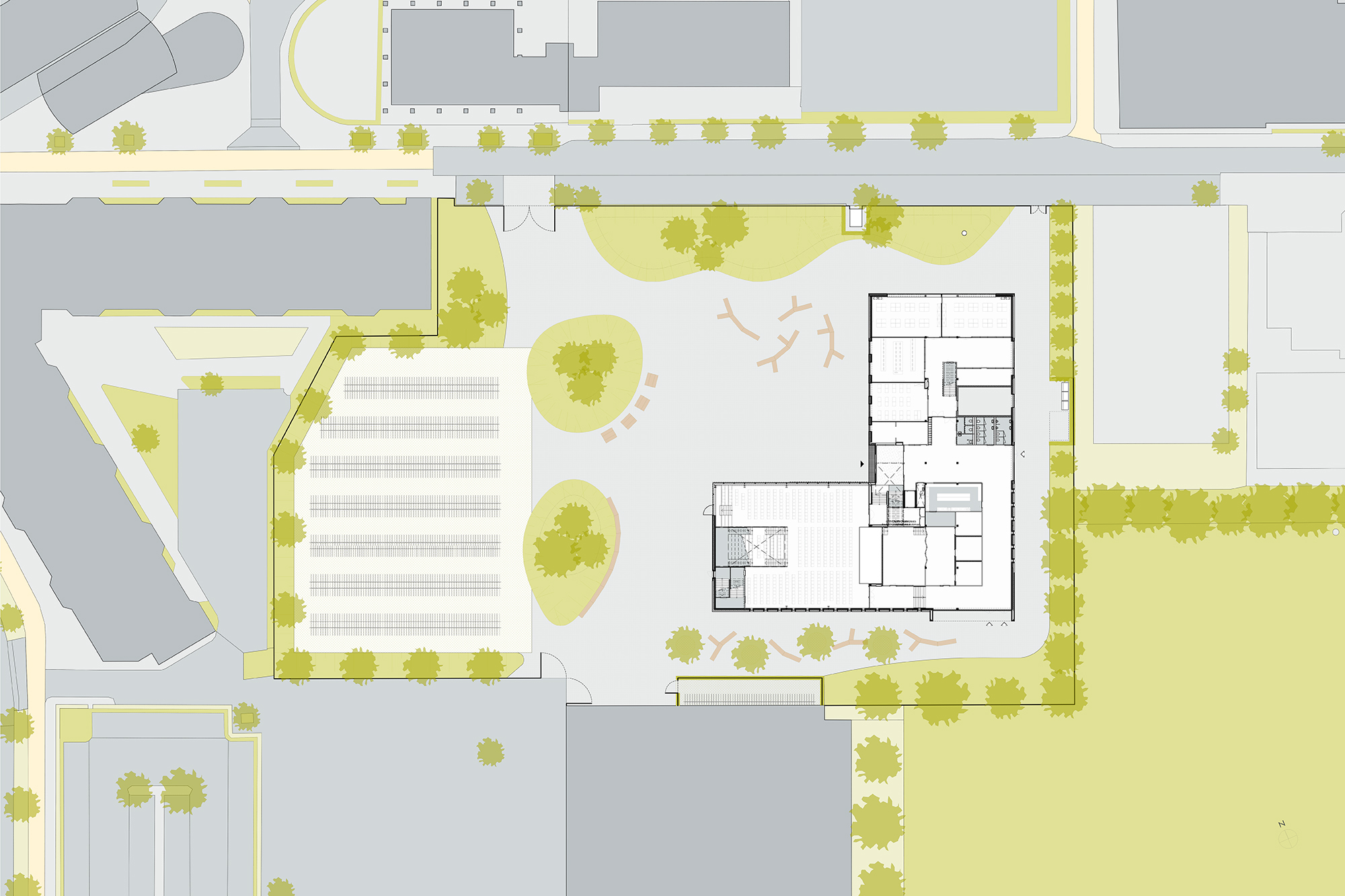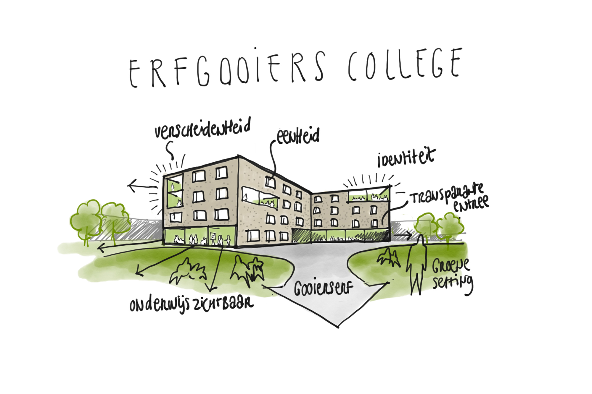 Het ontwerp manifesteert zich als een heldere massa in een L-vorm. Het staat vrij op de kavel en wordt daarmee alzijdig ontworpen. Het gebouw kent 4 bouwlagen en heeft daardoor een relatief kleine footprint. Het zorgt er voor dat het schoolterrein meer kan zijn dan een fietsenstalling en ruimte biedt voor groen. Het wordt een compact gebouw. Dat is in basis energetisch duurzaam een belangrijk uitgangspunt voor het klimaatconcept. In tegenstelling tot de huidige situatie is de hoofdentree in de nieuwe situatie gericht op het Gooierserf en bevindt daarmee in de ‘oksel’ van het gebouw.