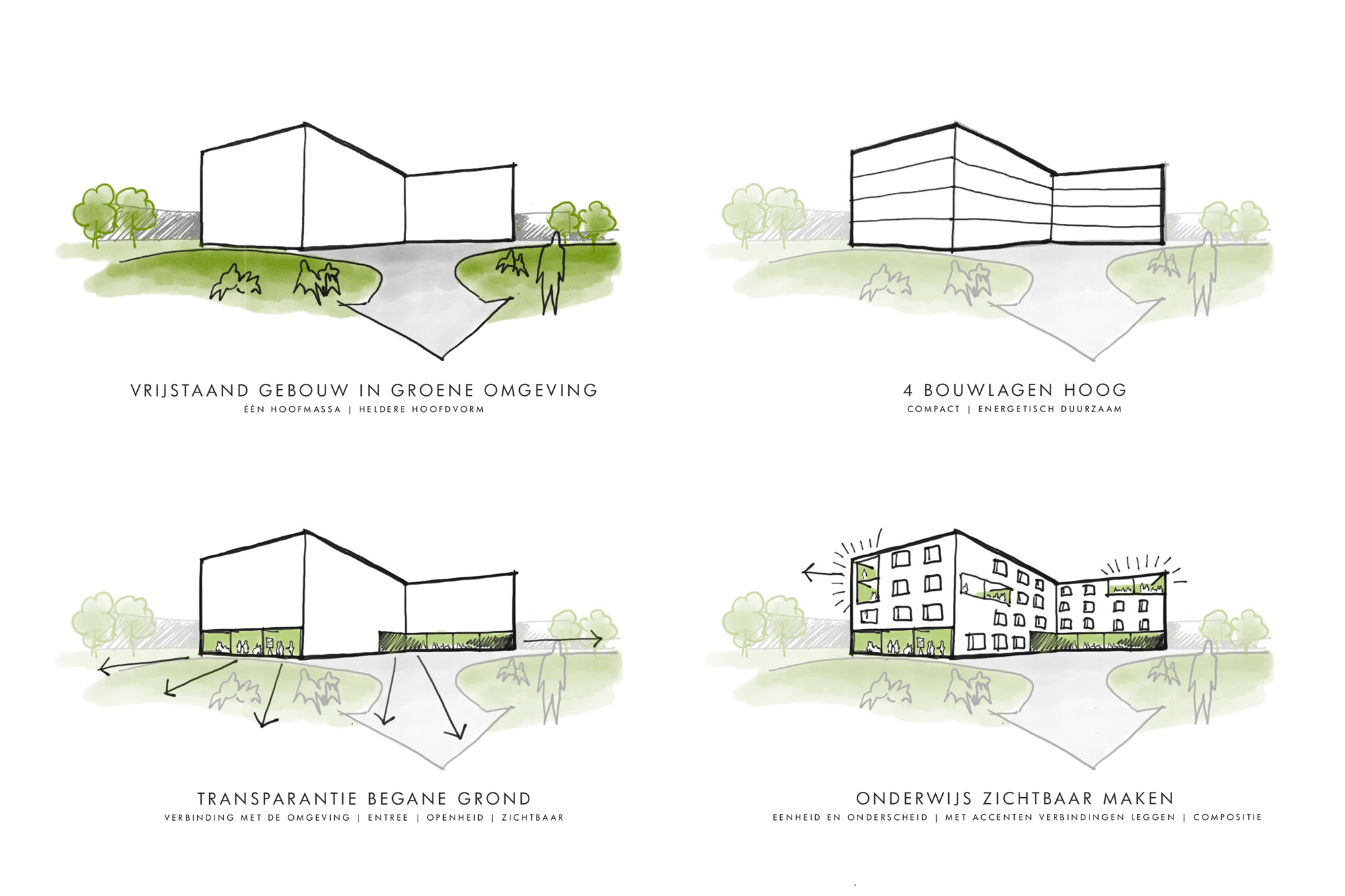 De gevel kenmerkt zich als een gebalanceerde compositie van open en dicht, van eenheid en verscheidenheid, waarbij de identiteit van de school de boventoon zal voeren. De gevel beschrijft een ritme door de repetitie van elementen, maar kent ook accenten ter verbijzondering. Door veel glas op de begane grond toe te passen, wordt het onderwijs zichtbaar gemaakt en ontstaat er een verbinding met de buurt.