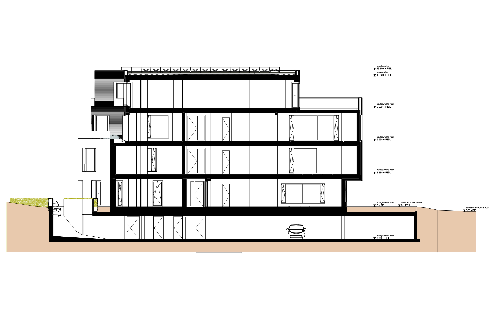 De gevels zijn benaderd als een compositie van dicht en open, waarbij zeer grote gevelopeningen in een verder gesloten vlak het beeld domineren en welke worden afgewisseld met kleine en ook verborgen openingen achter opengewerkt “Braziliaans” metselwerk. Afhankelijk van de positie en het uitzicht van de gevelopeningen wordt er gevarieerd met de diepte of vorm van de negge, waarbij een kozijn soms ook de hoek om gaat. De gevels zijn opgetrokken uit metselwerk met een specifieke bijzonder lange steen, waarmee verschillende metselwerk verbanden worden gemaakt. De gevels die te herkennen zijn als set back worden benadrukt door een reliëf in het metselwerkverband. Het metselwerk wordt afgewisseld met glad stucwerk ter plaatse van schuine negge’s en inpandige buitenruimte.